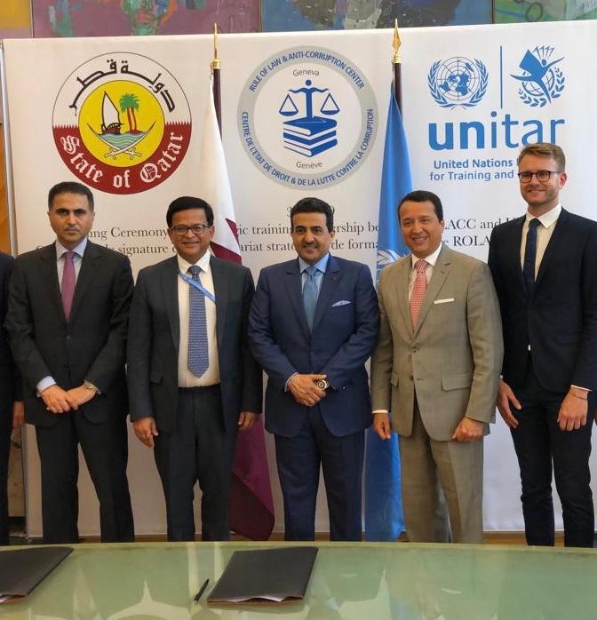 / August 4, 2019 Signing of new partnership agreement btw State of Qatar & @UNITAR, in cooperation w/ Rule of Law and Anti Corruption Center (ROLACC) HE the Attorney-General of Qatar and the United Nations Special Advocate against Corruption, Dr Ali bin Fetais al-Marri, and Assistant